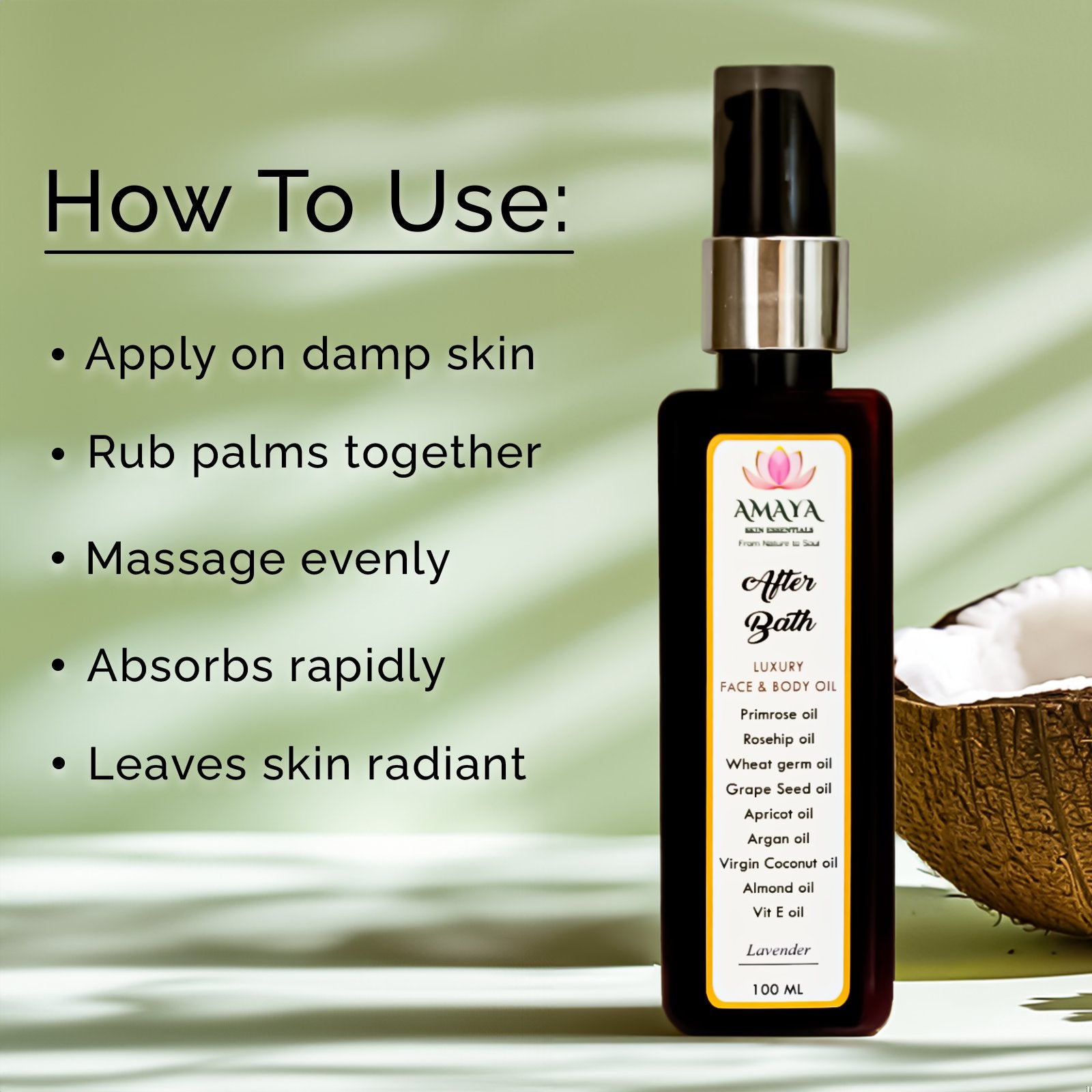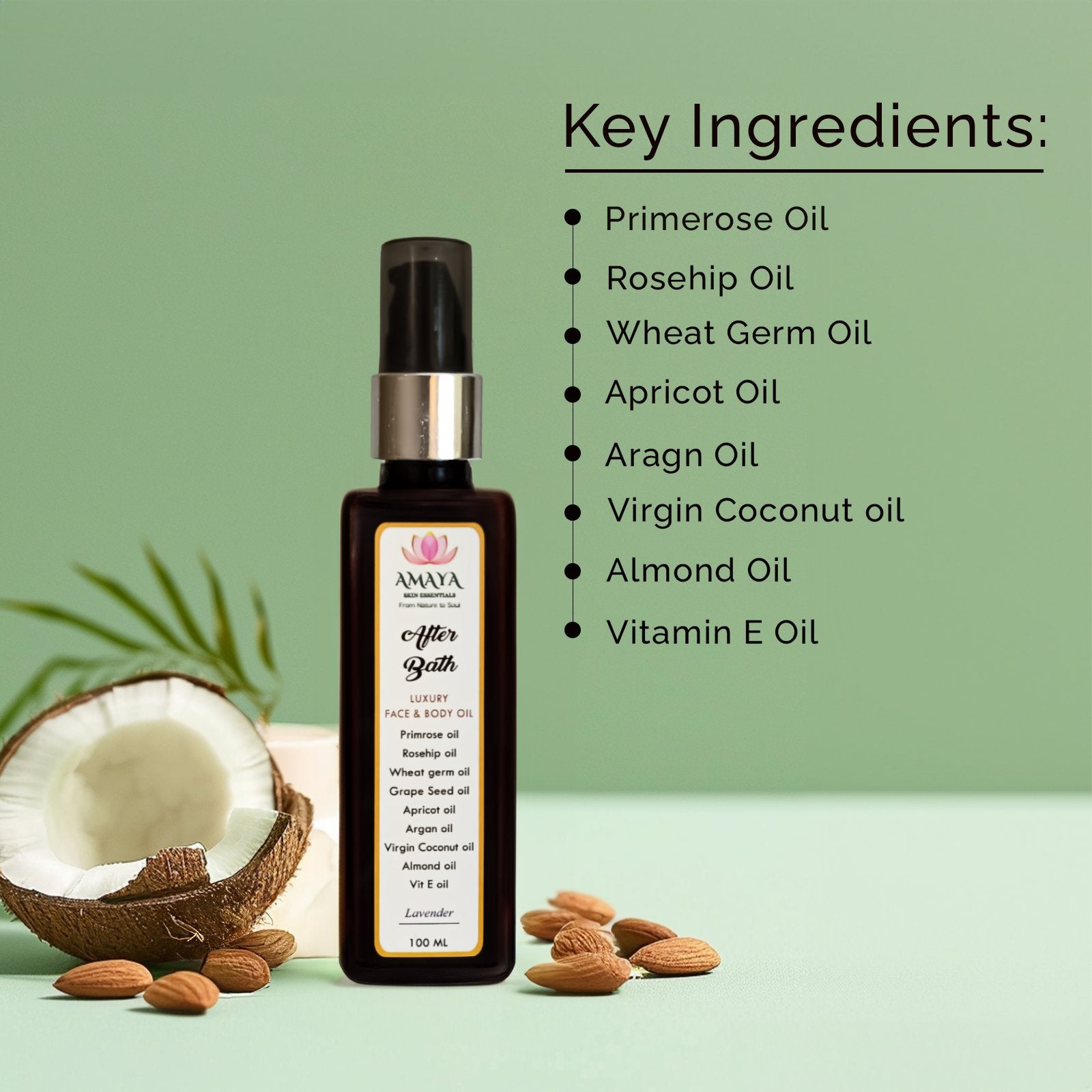 Discover the subtle touch of Ayurvedic wisdom blended with modern luxury in Amaya Skin Essentials After Bath Oil. This premium oil is expertly formulated to enhance your skin's natural moisture retention after bathing. Its non-comedogenic nature provides deep nourishment without clogging pores, making it ideal for all skin types. Rapidly absorbed, this oil leaves your skin feeling silky and enriched, while a hint of lavender creates a serene, aromatic experience, reflecting a harmonious balance between traditional practices and contemporary skincare.