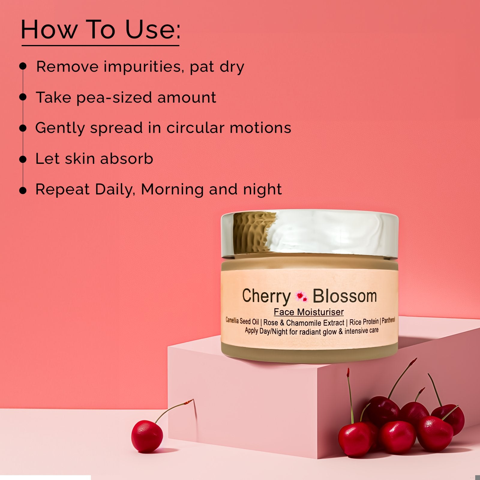 Repeat - For optimal results, use Cherry Blossom moisturiser daily. Apply it in the morning to protect and nourish your skin throughout the day, and again at night to repair and rejuvenate while you sleep.