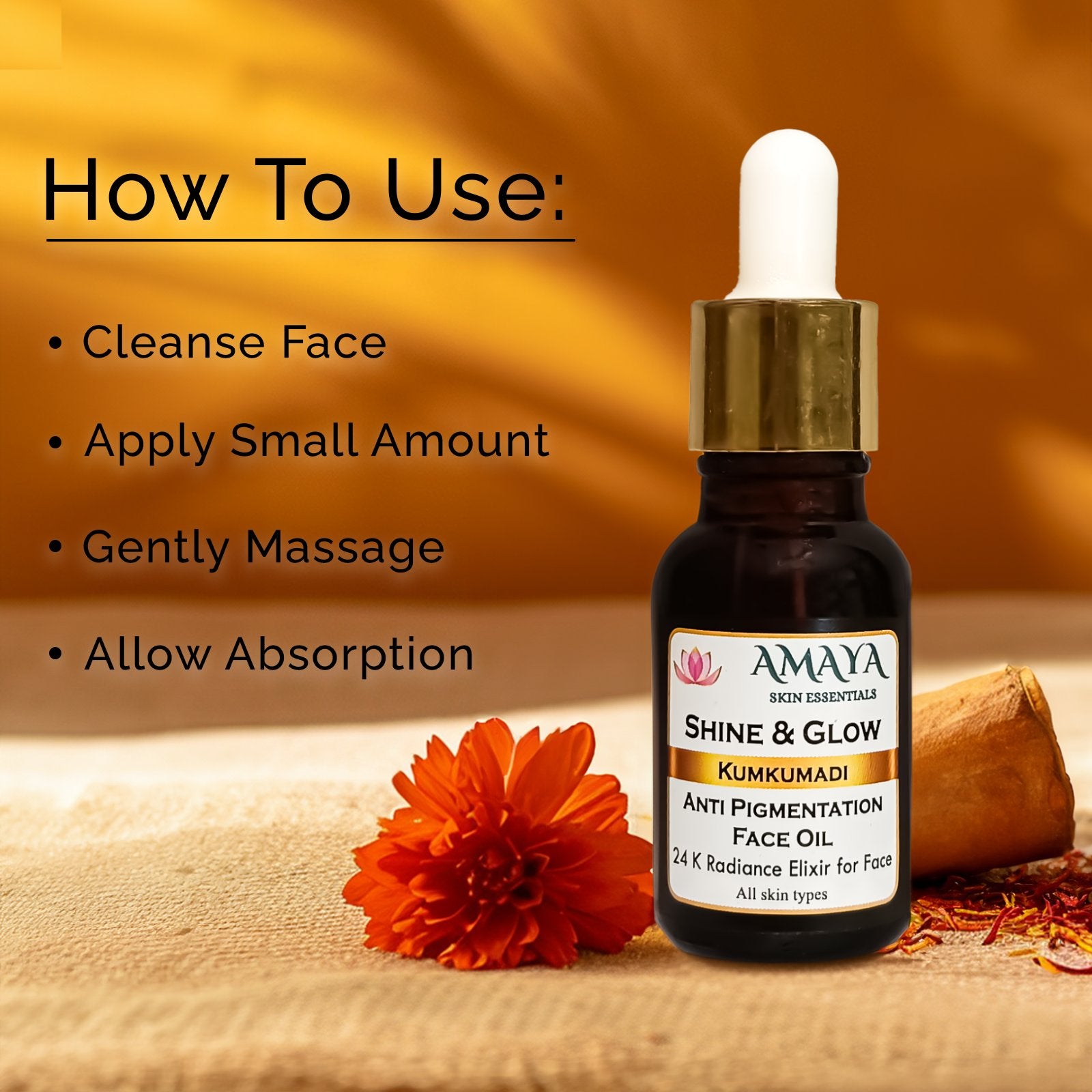 Elixir Embrace: Take a few drops of the Kumkumadi Serum in your palm, feeling its silken texture. Inhale deeply, embracing its earthy, rejuvenating aroma.