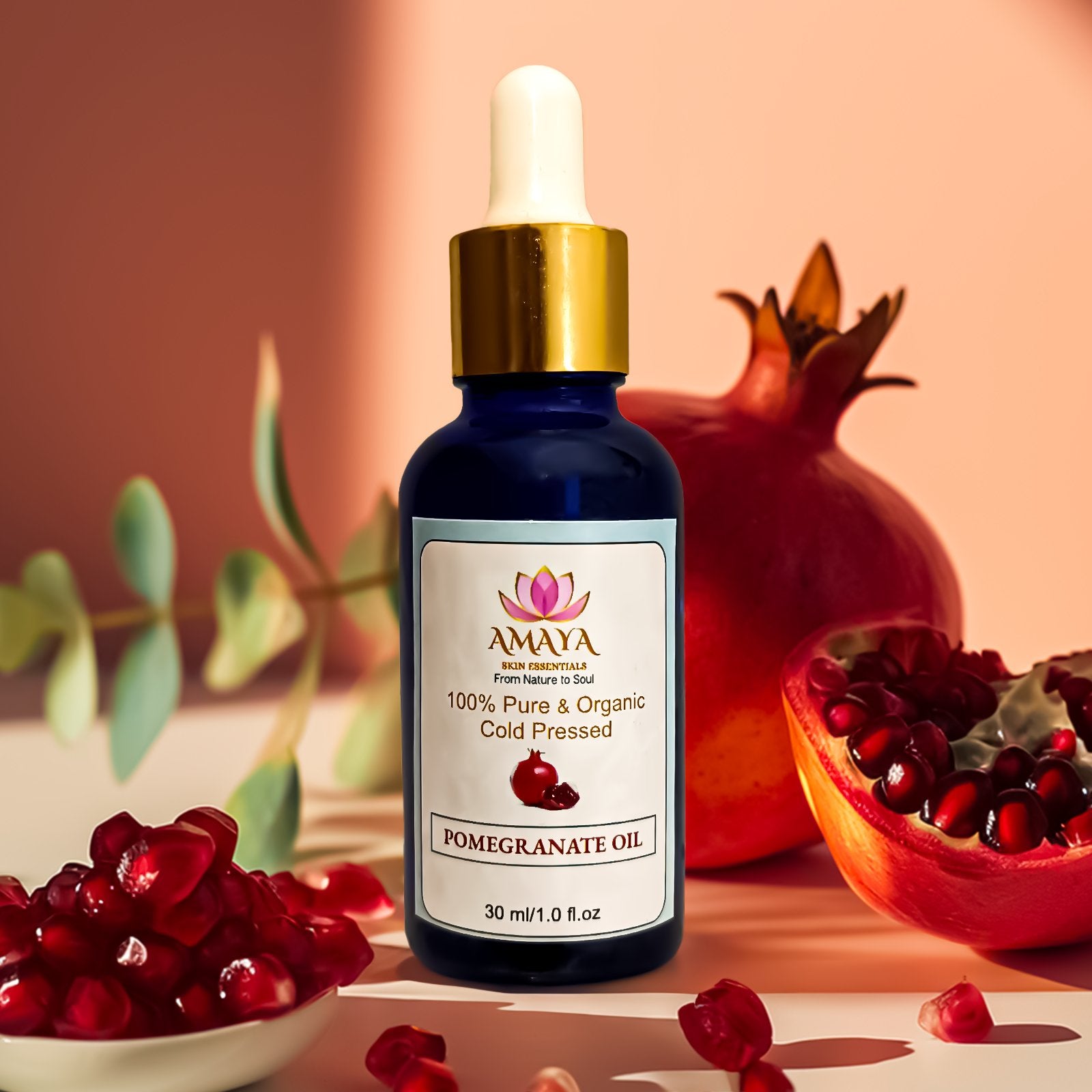 Amaya's Pomegranate Oil, meticulously derived from the seeds of the luscious pomegranate fruit, is a skincare sanctuary in a bottle. This luxurious oil is a celebration of nature's profound healing and restorative powers, offering a wealth of benefits for your skin. Its antioxidant-rich composition not only guards against free radical damage but also hydrates and moisturizes deeply, leaving skin feeling velvety and rejuvenated. This oil is a champion of youth, enhancing collagen production to visibly reduce fine lines and wrinkles, and soothing inflamed or irritated skin for calming relief. It remarkably improves skin texture and tone, revealing a youthful, radiant complexion. This oil is adept at fading scars, age spots, and hyperpigmentation, resulting in a more even skin tone. It forms a natural shield against environmental pollutants and UV damage, while its lightweight, non-greasy nature ensures quick absorption, making it suitable for all skin types. Additionally, it supports skin regeneration, aiding in the healing of damaged skin, and boosts overall skin health and vitality, unveiling a natural, enviable glow.