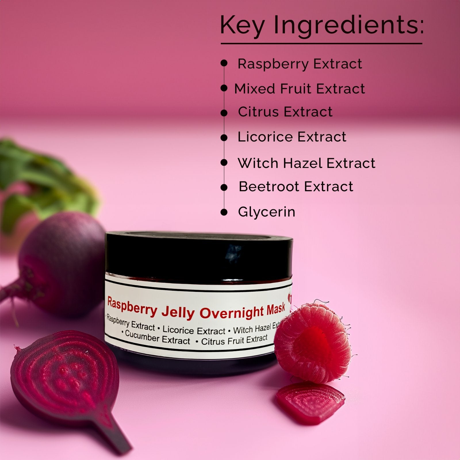 Rich in antioxidants and Vitamin C, the Raspberry Jelly Overnight Mask is a potent blend of nature's finest ingredients. Raspberry extract illuminates the skin, while licorice extract gently soothes and evens out skin tone. The mask also features cucumber extract, revered for its anti-aging properties, and witch hazel extract, known to reduce acne and refine pores. Together, these elements work in harmony to gently exfoliate, clarify, and revitalize your skin, making it suitable for all skin types.