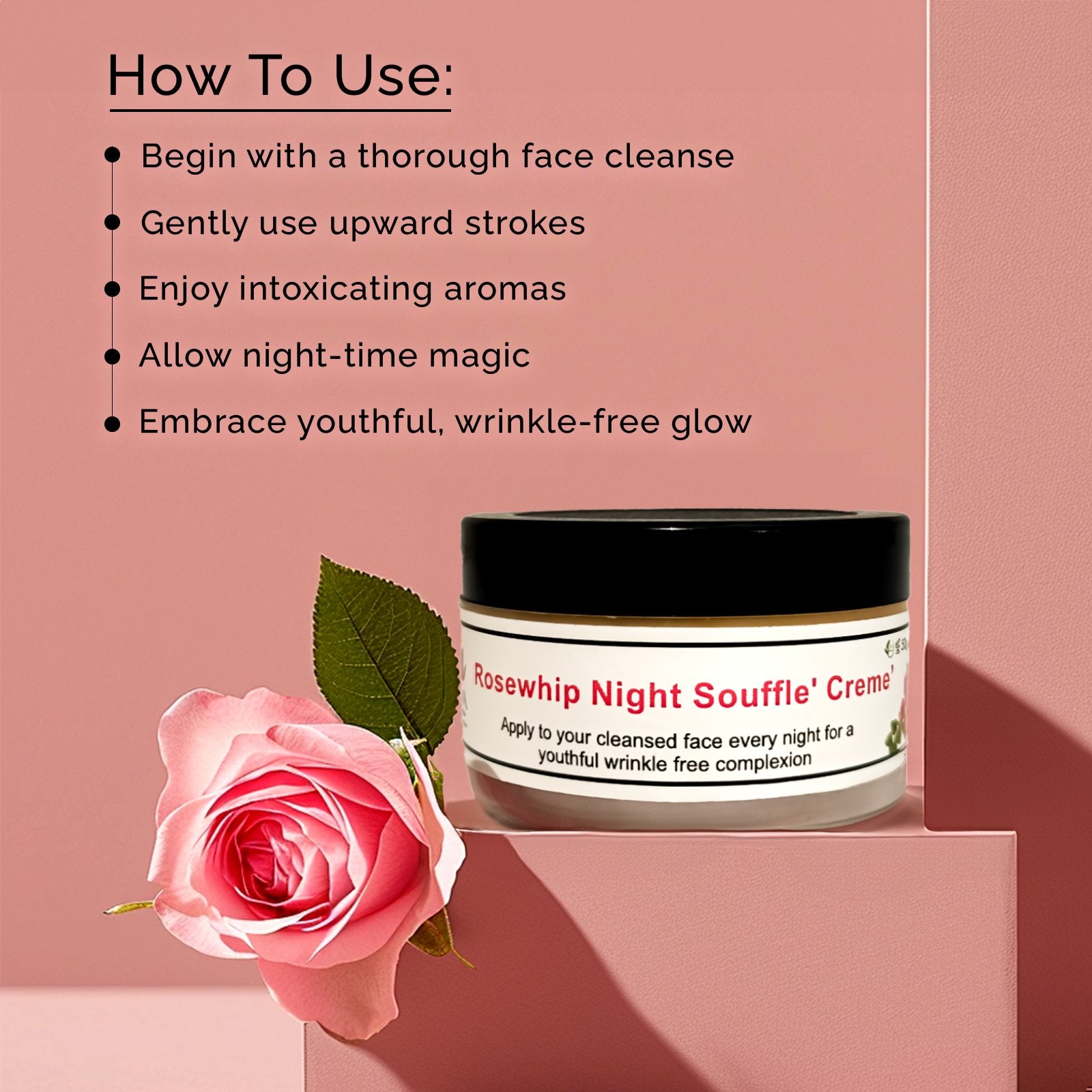 For a transcendent beauty ritual, begin by cleansing your face thoroughly. Take a small amount of the Rosewhip Night Soufflé Cream and gently apply it to your face and neck using upward strokes. As you massage the cream into your skin, allow its rich texture and intoxicating aromas to envelop your senses. The cream will work tirelessly through the night, ensuring you awaken to a complexion that is visibly smoother, plumper, and radiantly youthful. Embrace this nightly indulgence for a wrinkle-free, glowing visage, courtesy of nature's finest ingredients.