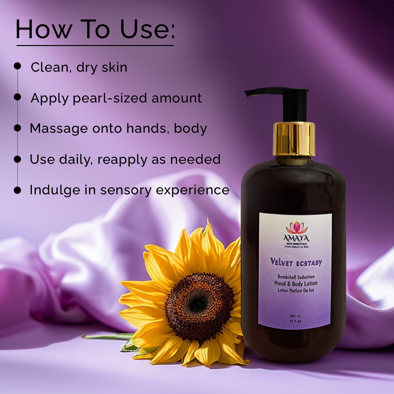 Application: Take a pearl-sized amount of Velvet Ecstasy Cream and gently massage it onto your hands and body.