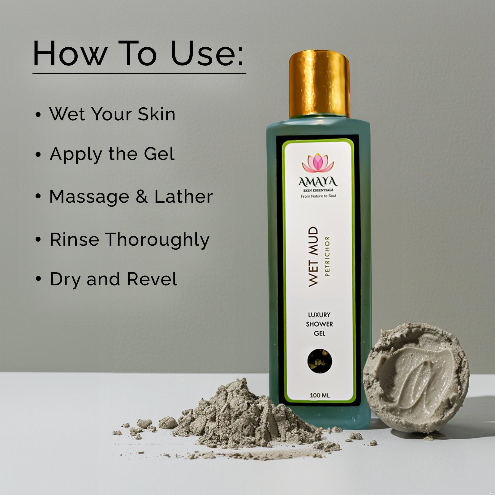 - Apply Generously: Squeeze a small amount of the Wet Mud Shower Gel onto a loofah or your palms.